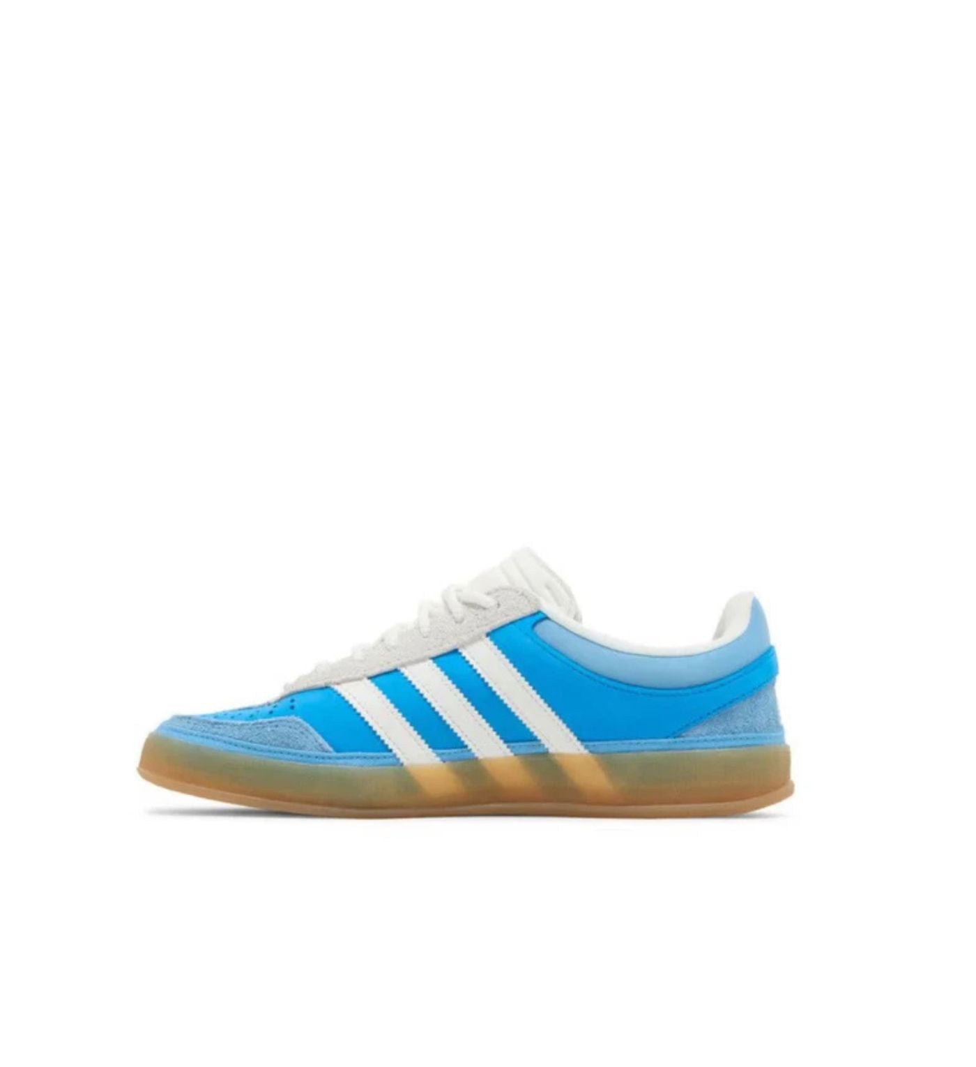 The Bad Bunny x adidas Gazelle Indoor 'San Juan' takes inspiration from the sunny skies and beaches of the reggaeton artist's hometown. A vibrant shade of blue is executed on the leather upper, featuring a perforated toe box and an asymmetrical forefoot overlay in hairy suede. In addition to white leather three-stripes, branding elements include a size label on the suede heel panel and