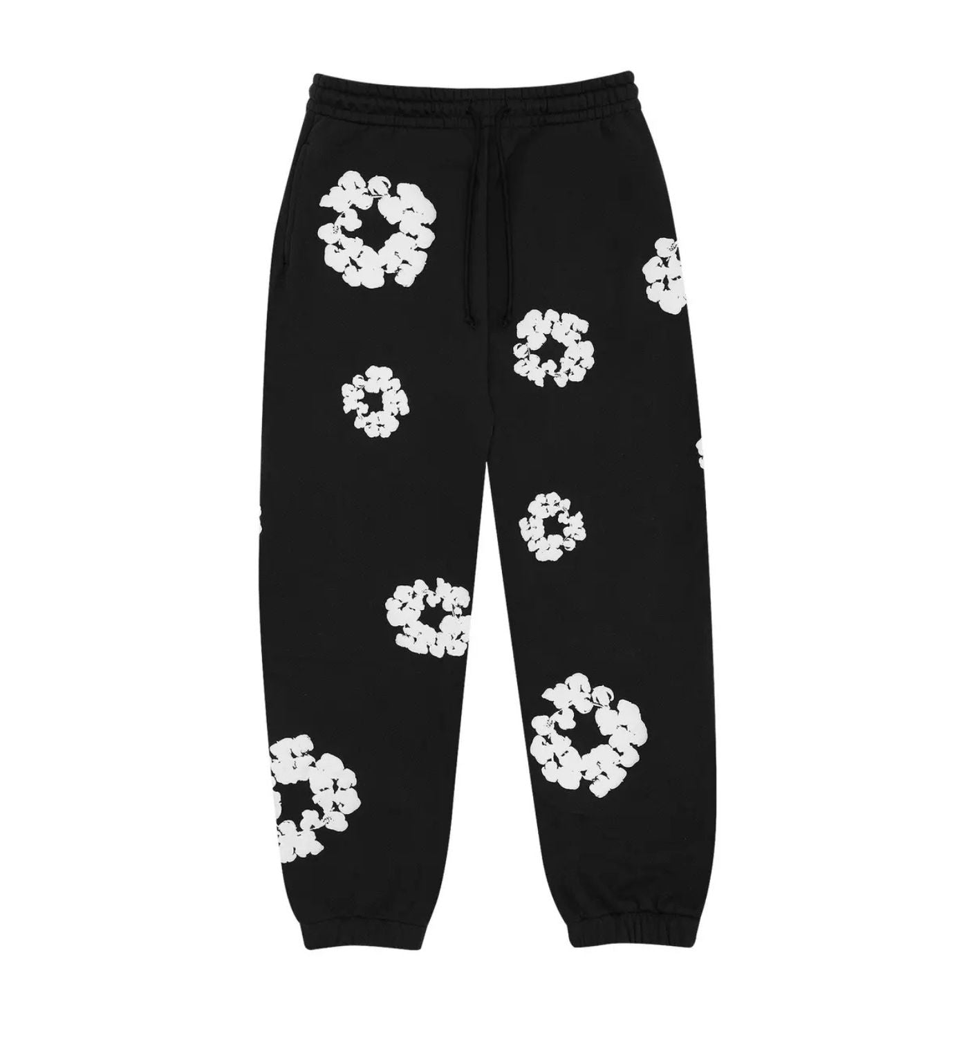 The "Denim Tears The Cotton Wreath Sweatpants Black" are sweatpants that were designed as part of a collaboration between Denim Tears and Cotton Wreath.