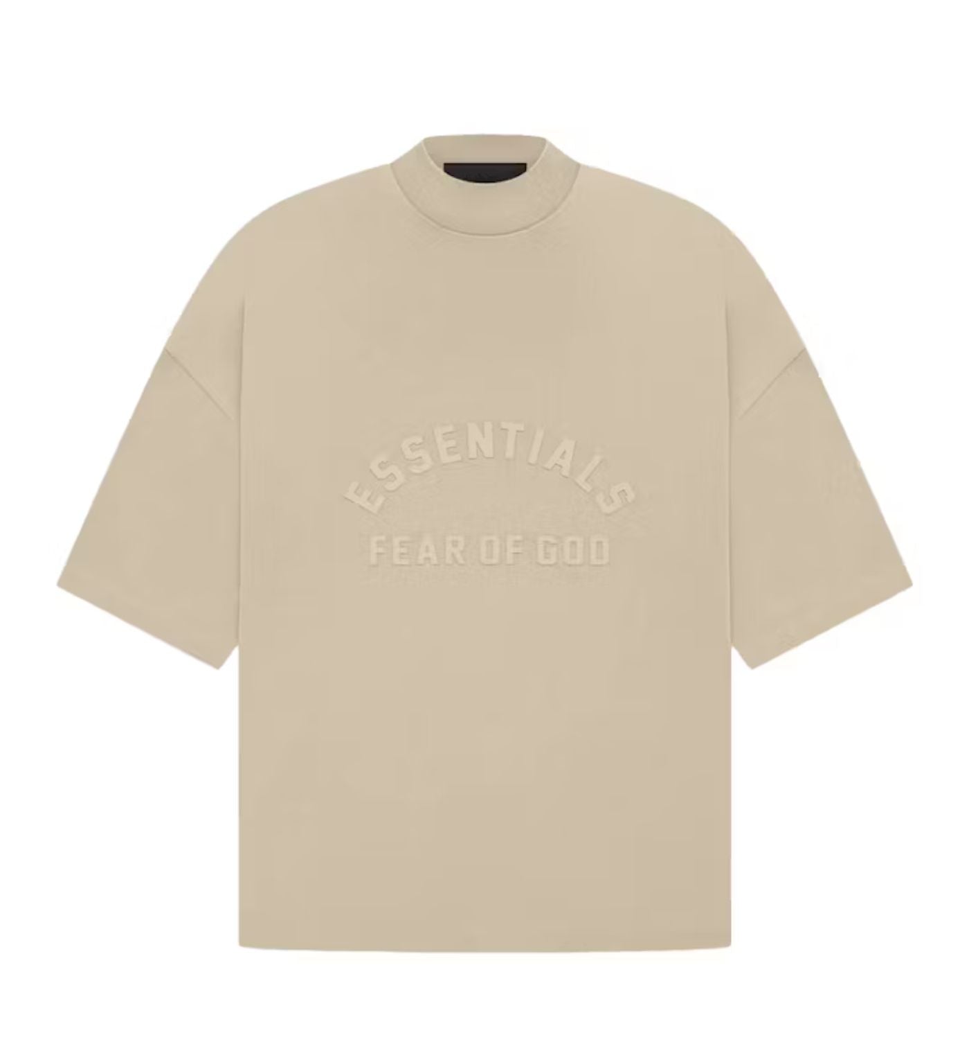 The Fear of God Essentials tee shirt has been redesigned with increased volume in the body and sleeves, providing additional drape and comfort. A revised rib-knit collar sits higher on the neckline, adding structured formality. The curved Essentials Fear of God logo is vintage-inspired but updated in a rubberized soft-touch applique. A new Fear of God rubberized label is at the back collar.