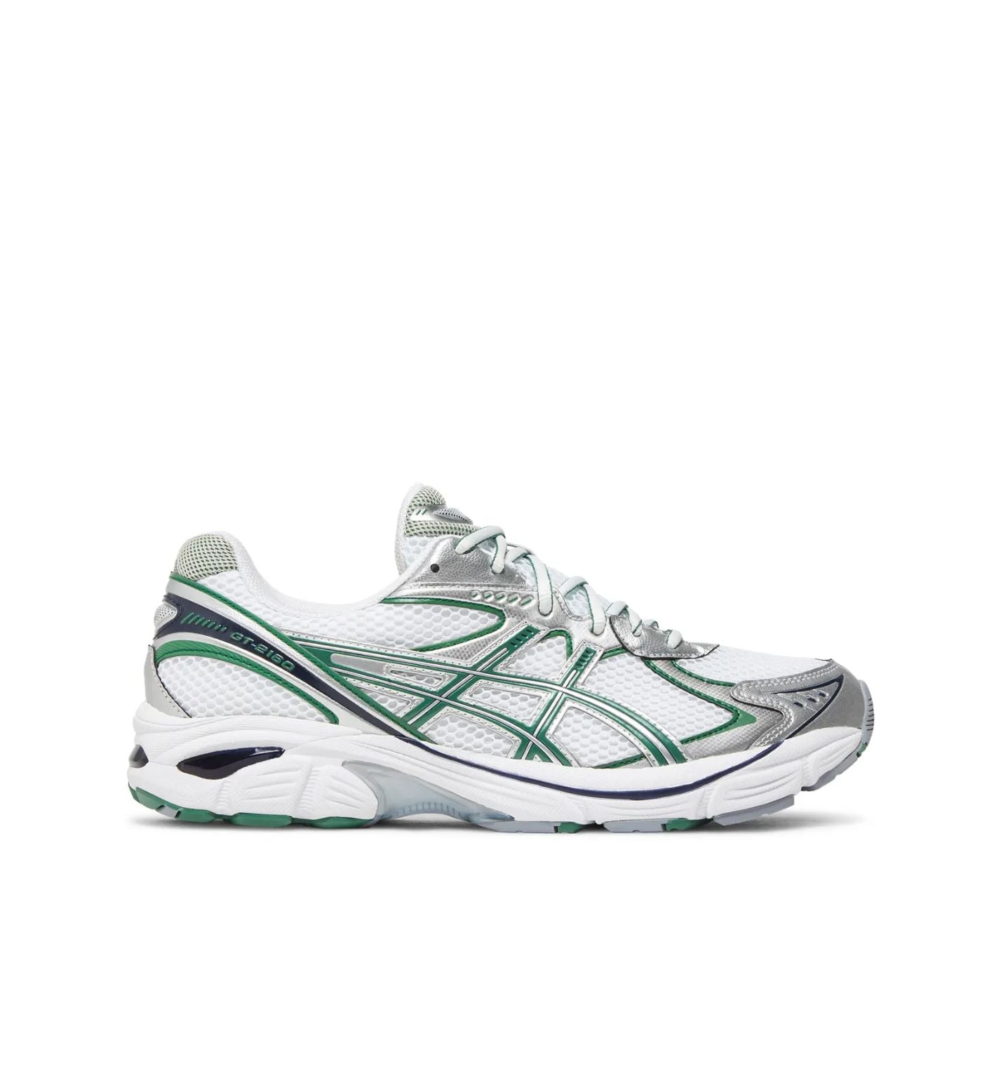 The ASICS GT 2160 'Shamrock Green' features ventilated white mesh with synthetic leather overlays in metallic silver. Lush green accents add contrasting pops of color along the forefoot and heel, as well as the signature tiger stripes. ASICS branding appears on the tongue and sockliner. Underpinning the sneaker is a lightweight EVA midsole with visible Gel cushioning and an exposed TPU shank.