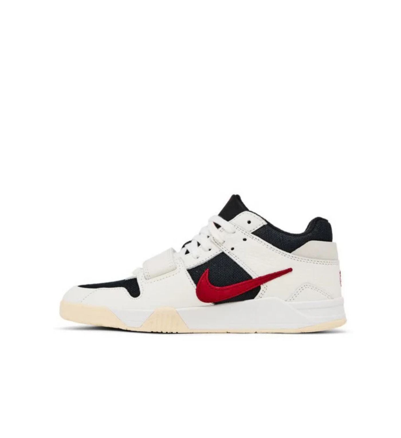 The Jordan Jumpman Jack TR 'University Red' dresses Travis Scott's debut signature shoe with a black canvas upper, contrasted by off-white tumbled leather overlays and a color-matched midfoot strap. A red Jumpman logo decorates the tongue, matching the backward suede Swoosh on the lateral side. The Cactus Jack face logo registers an appearance on the back heel.