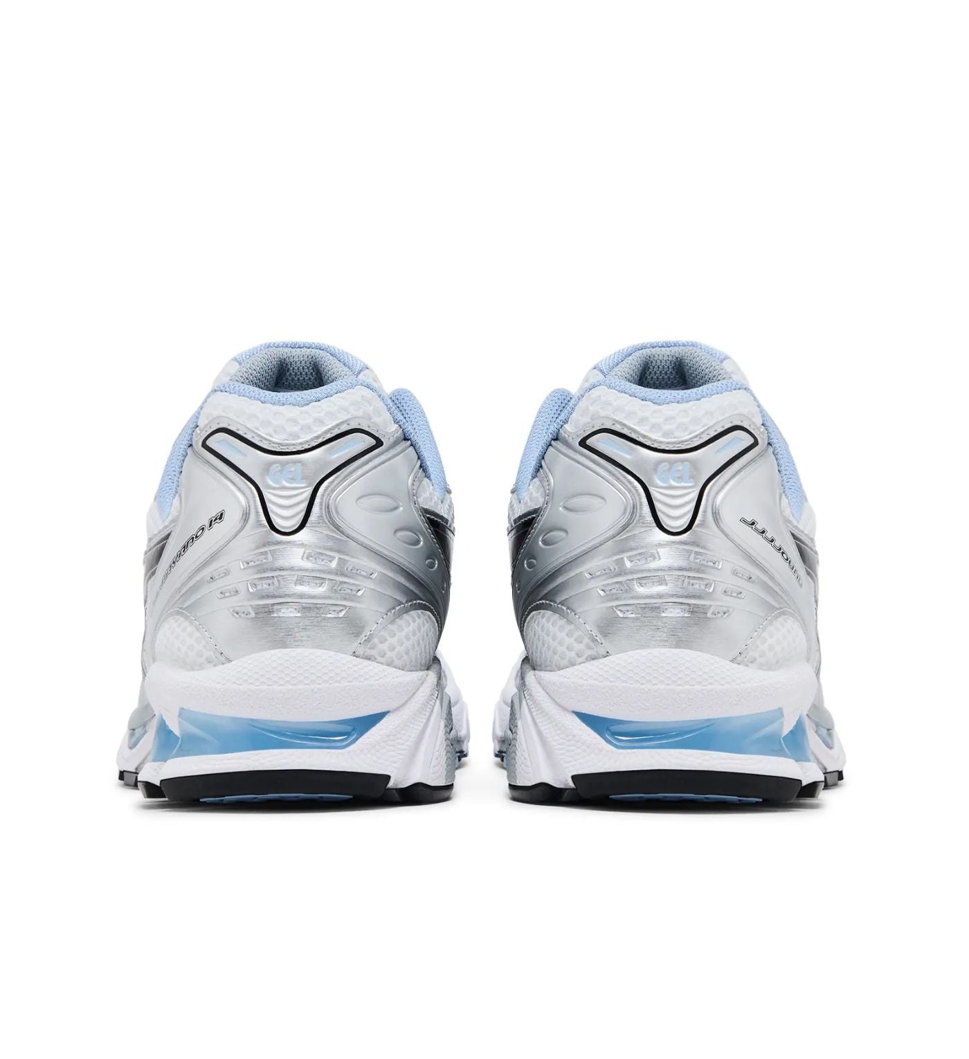 The JJJound x ASICS Gel Kayano 14 'White Baby Blue' features an airy white mesh upper with synthetic overlays in metallic silver. Black tiger stripes sweep across the side panel, while JJJJound branding adorns the lateral heel of the right shoe. Pastel blue accents appear on the collar lining, as well as the Gel inserts that augment the lightweight EVA midsole.