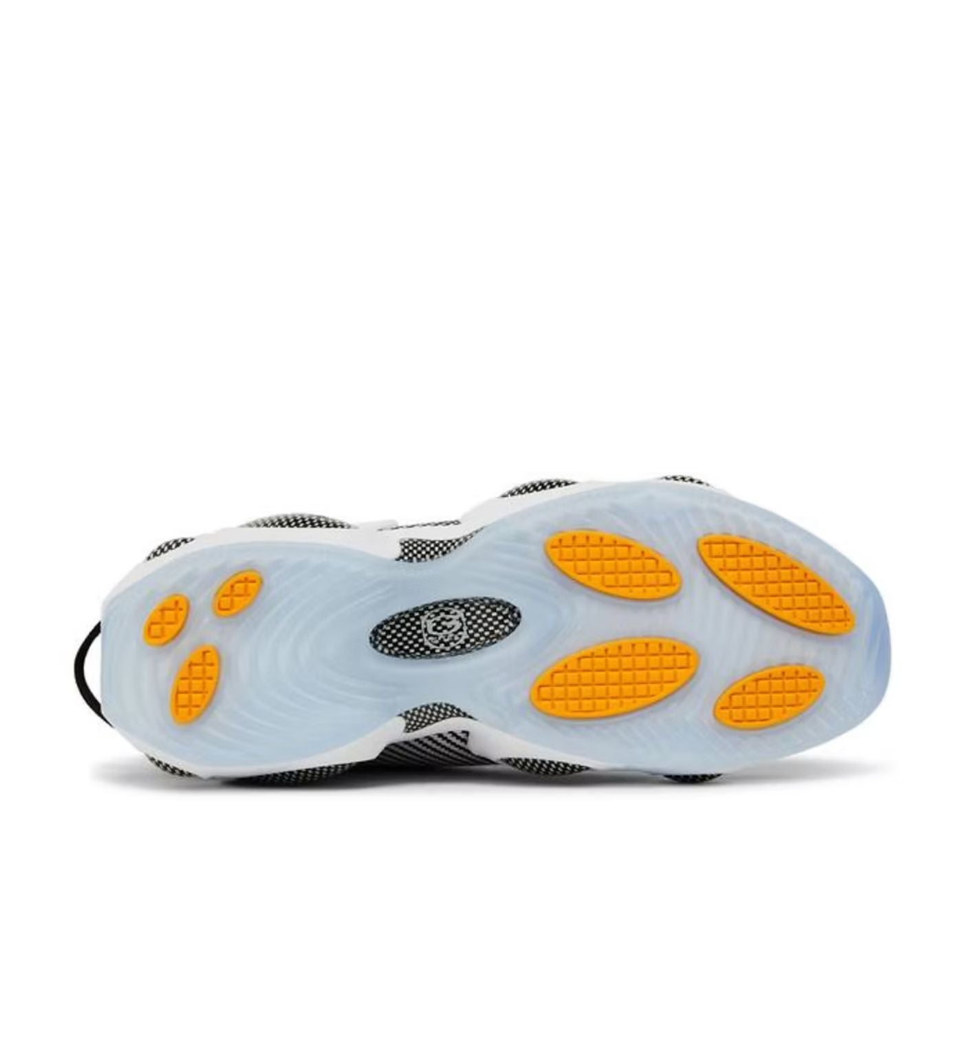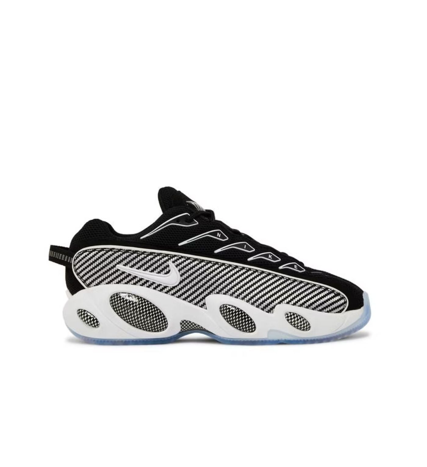 The Nike NOCTA Glide features a black and white color scheme with a significant part of the upper appearing in black while the midsole is white and the outsole is translucent grey with a touch of orange on the underfoot. It also has carbon-inspired mudguards running across both side panels and a white chunky midsole providing reinforcement on the shoe. Some of the branding details on the shoe include Nike branding on the eyestays and the NOCTA trident logo and glossy NOCTA badges on the tongue.
