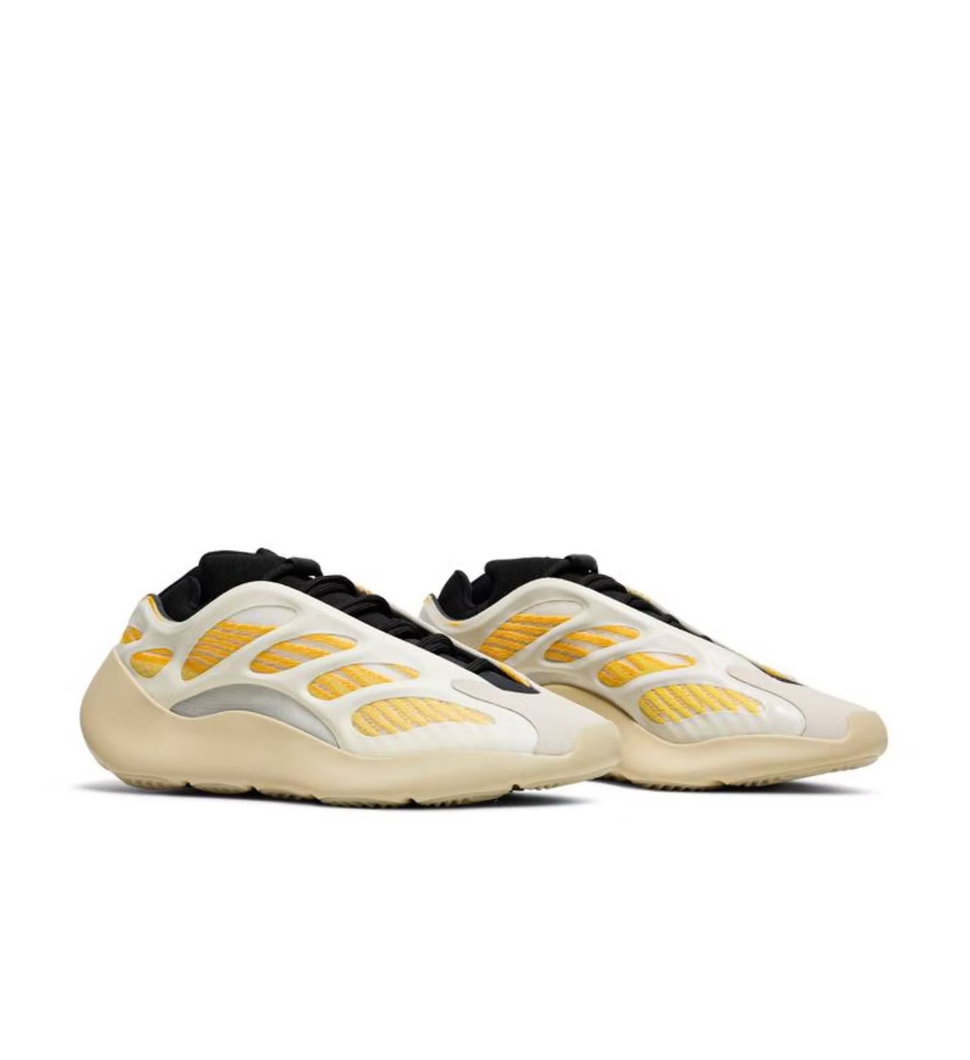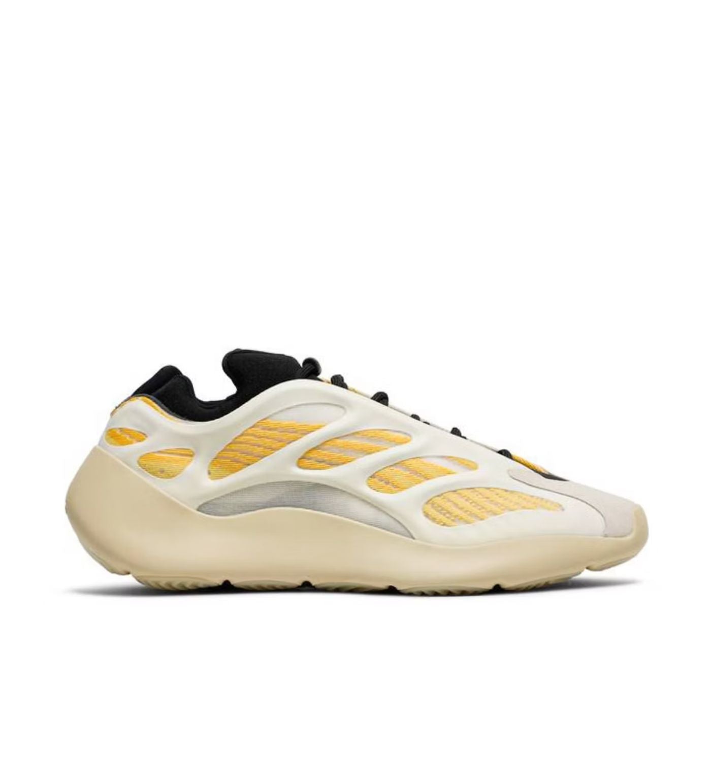 The adidas Yeezy 700 V3 Safflower features a black premium leather upper with rubber overlays and mesh underlays. From there, a ribbed one-piece outsole and textured yellow streaks of synthetic material woven across the midfoot complete the design.