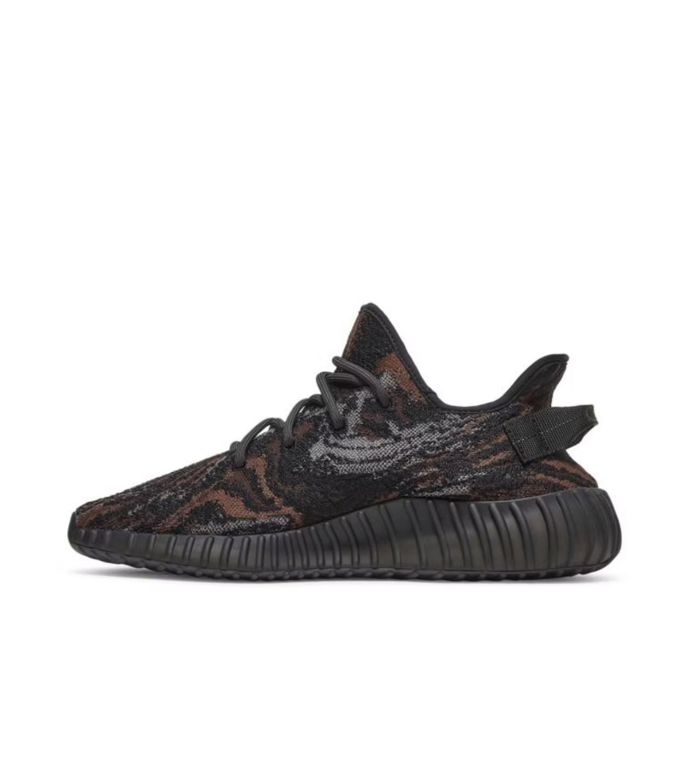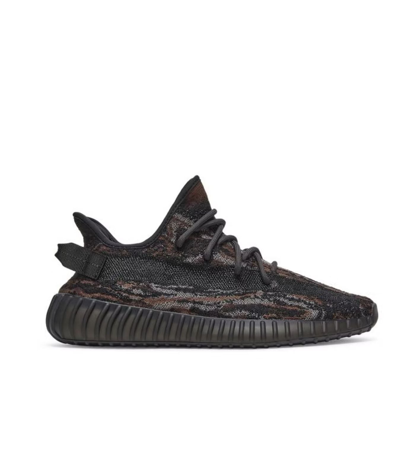 The adidas Yeezy Boost 350 V2 MX Rock features a marbled black, grey, and brown Primeknit upper styled in a pattern similar to the Yeezy 350 V2 MX Oat, only with dark tones. In signature fashion, a cushioned Boost sole, heel tab, and mesh side stripe complete the design.